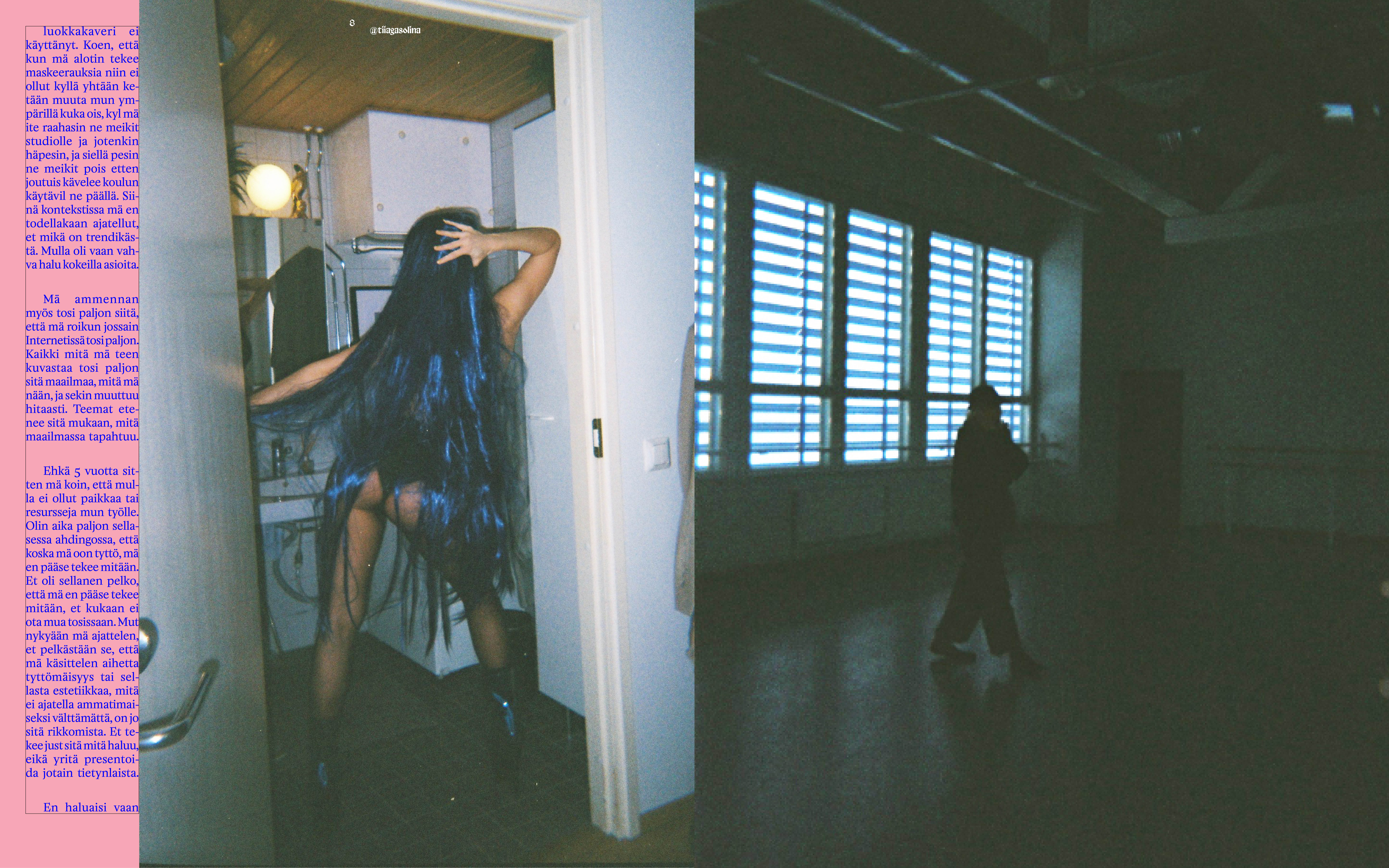 Zine of Tiia Kasurinen with interview and photography made by the designer Elina Äärelä in Spring 2022. The Publication was made for Äärelä’s studies with Visual Communication Design.